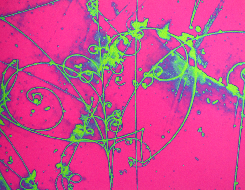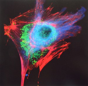 Endothelial cell from the lining of a cows pulmonary artery, illuminated using molecular labels which glow under a fluorescence microscope