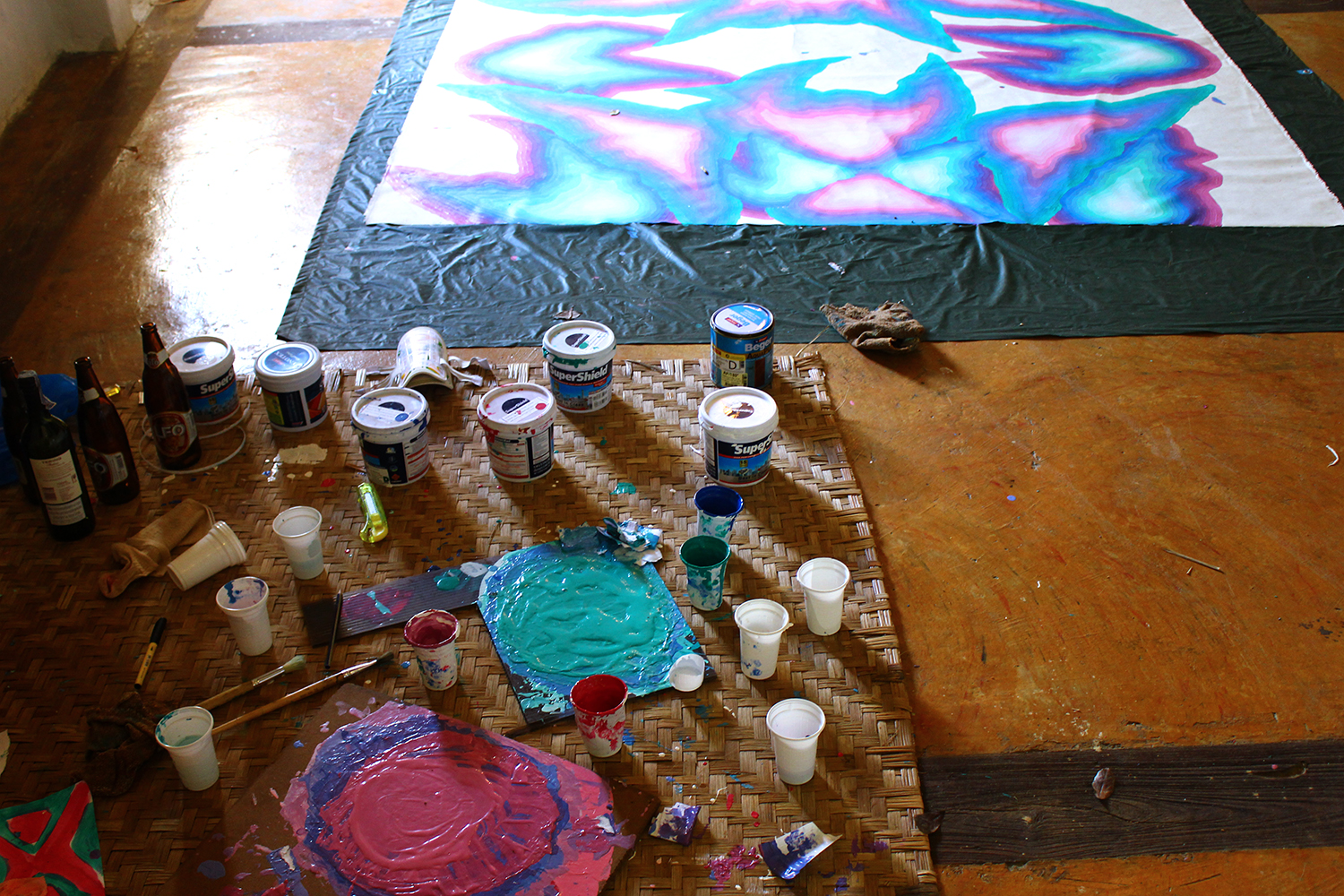 Starting off my residency with Ne’na in Chiang Mai painting large scale op art. And what a mess I’m making, beginning to look like a real artists studio.