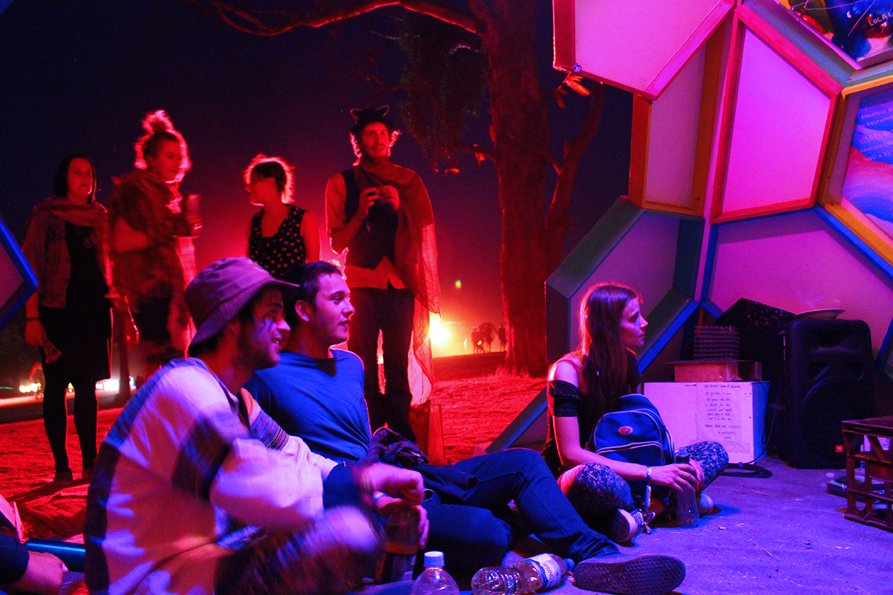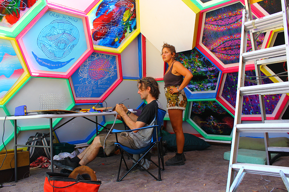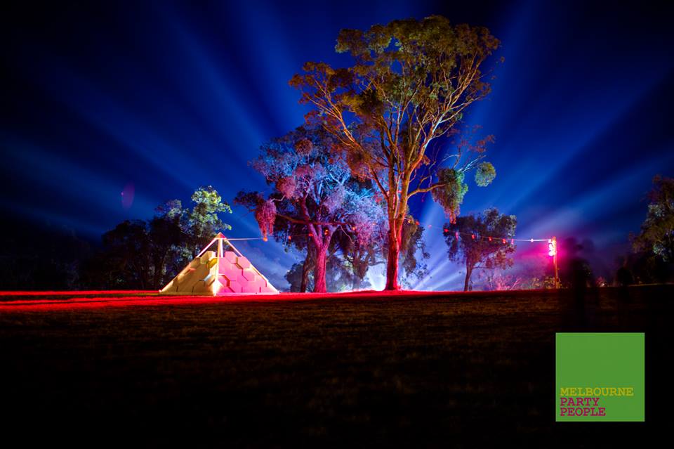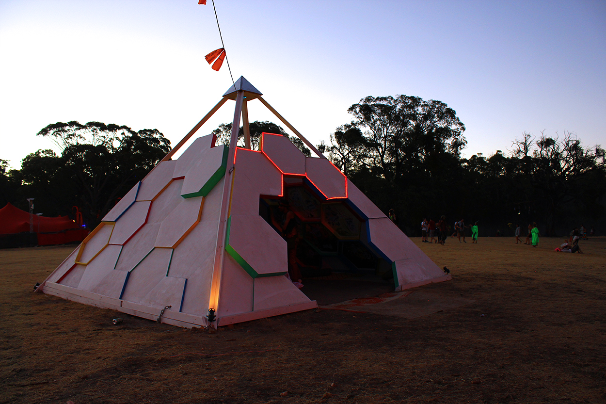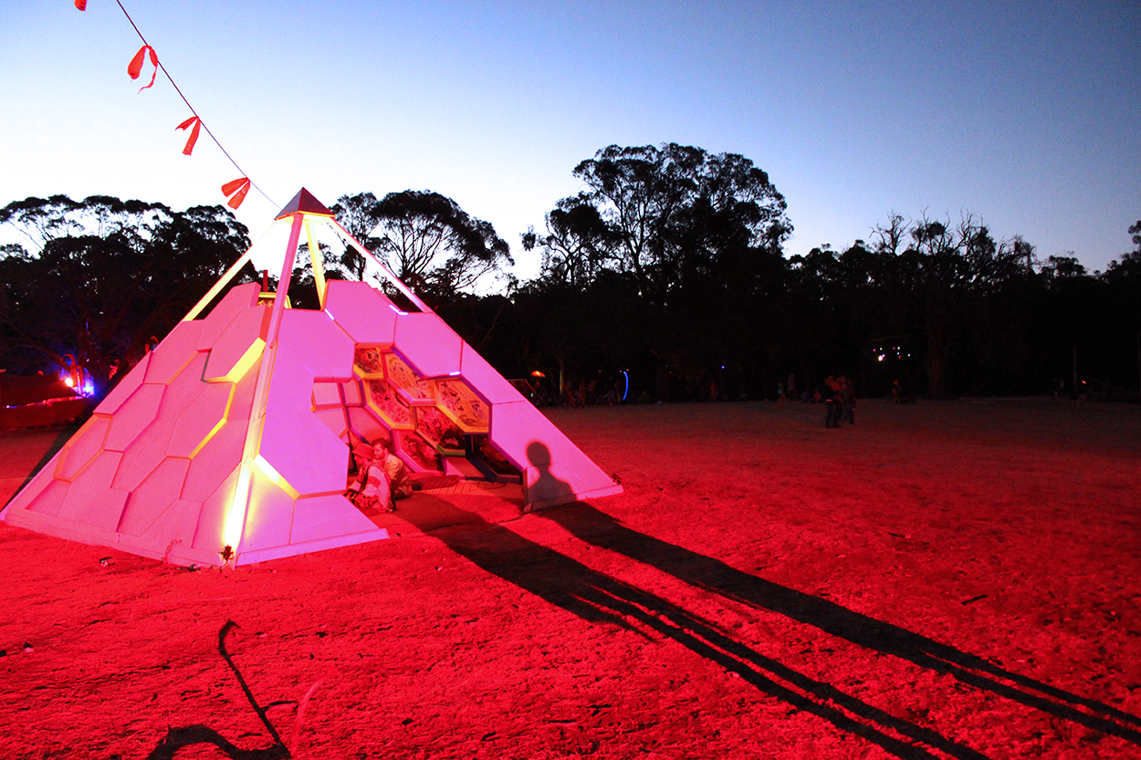 Constructed of 38 interlocking hexagons and 27 half hexagons, each hexagon was cut into 16ml ply and then framed with 3’1 or 6’1 timber to create a tessellating open top pyramid. Pre fabricated and stackable, the temple was loaded onto the back of a ute and trailer then transported 12 hours from inner Sydney city to the festival site of Lexton, 2 hours outside of Melbourne city on private bushland. Dave Tracey created the initial 3D model and worked out all the tricky design and math problems. Interior science themed decor panels where created by visual artists Marcelle Robbins, Lillian Morrissey and yours truly. Programmable LED’s outlined six hexagons to create mesmerising animated sequences in the evening. During the festival Owen Brasier, a science educator (and master of LEDs) hosted a small activities program consisting of simple science experiments including DNA extraction and chemical reactions to the delight and awe of festival participants.