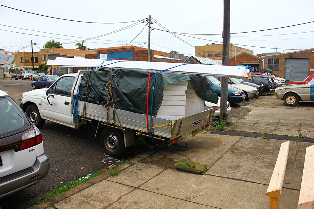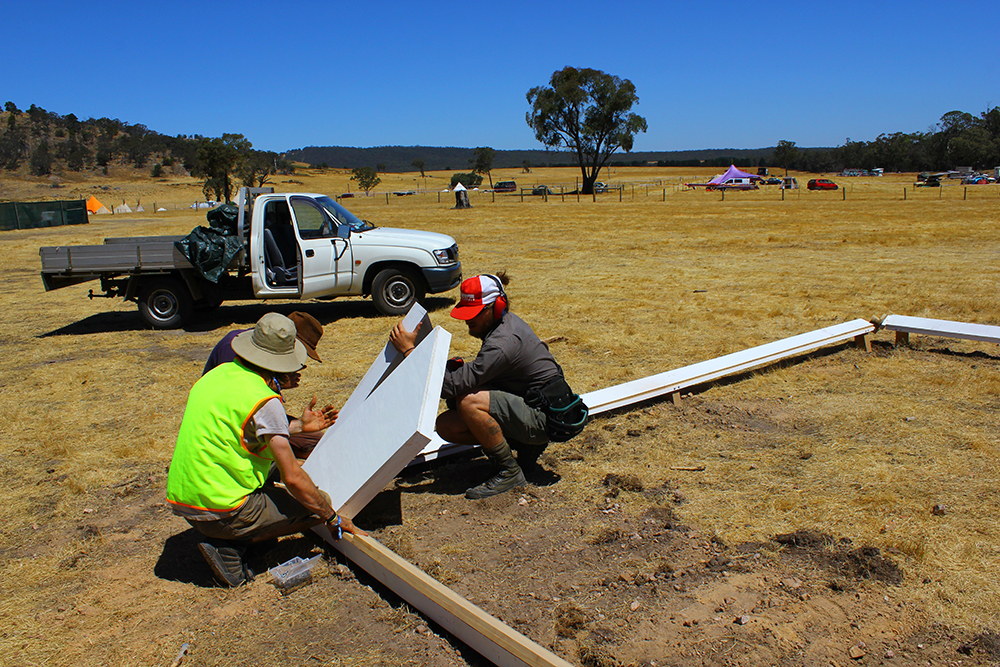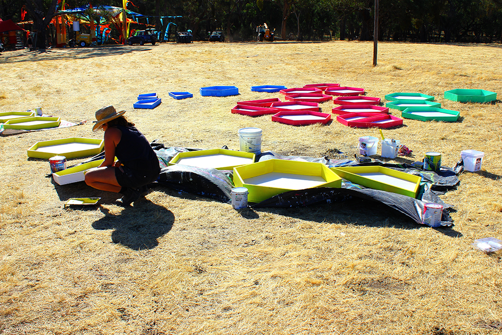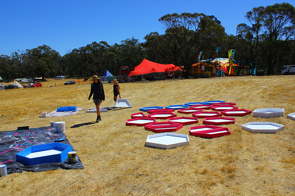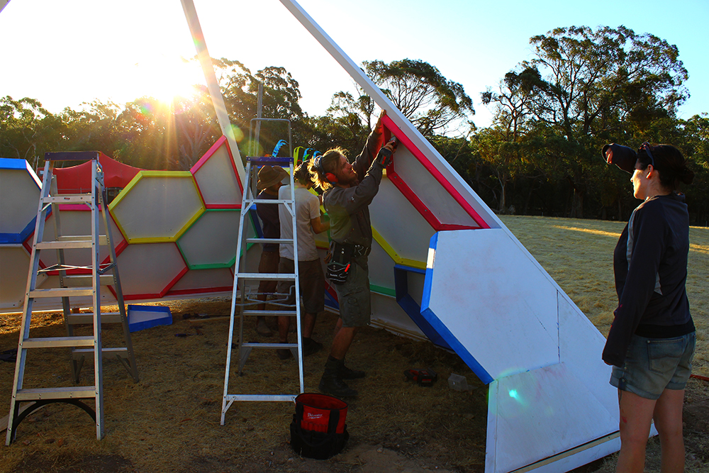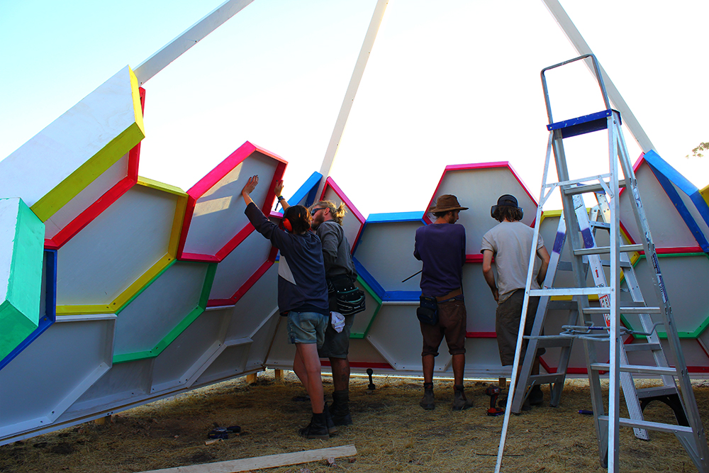 In the end the achievement of this project relied heavily on the close knit alternative art community centered around the inner Sydney suburb of Marrickville (loosely referred to as MWA or the Marrickville Warehouse Alliance). The hexagons where built over two weeks of measuring, cutting, filling, sanding and painting by a small army of great friends who worked for the price of love and beer. Without the support network of people with creative attitudes a work of this scale could not have been achieved on a small budget.