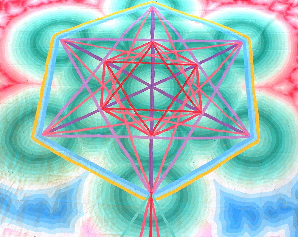Working from an exposed studio on the rooftop of a Berkeley warehouse complex, I spent a couple of weeks hanging out with the excellent people from Sacred Spaces Village and made them an original painting for their camp at Burning Man 2014. Conceived as a sacred geometry dancefloor, the project went from an unrealistic oversized work of epic proportion to a more achievable scale as the backdrop for the Sacred Spaces stage. My design concept was to create a Metatron’s Cube as the astral projection of Buddhas third eye connecting with an overlay of the sacred proportions of Buddhas face. The exposed studio environment posed a challenge when it rained one evening and destroyed several days work. As the story goes the stage ended up being too small for the painting so someone decided to hang it from a school bus.. which is fitting because as they say, Burning Man is a place where plans go to die and immediacy and impermanence rule.